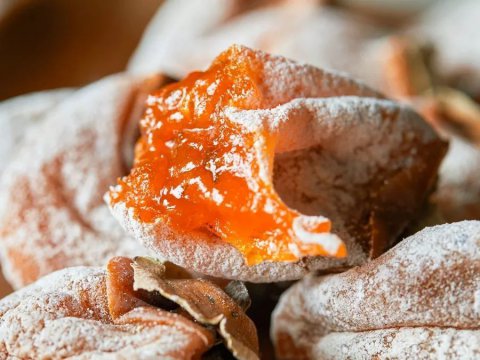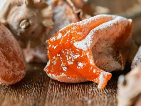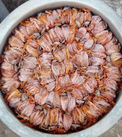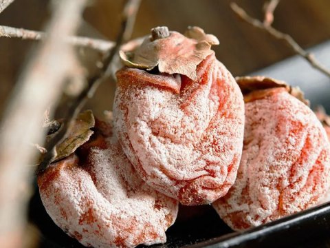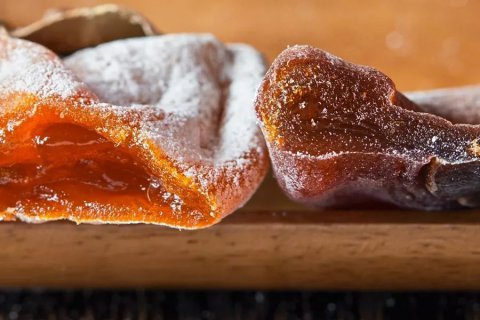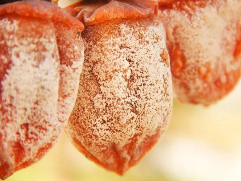 覆盖在柿饼表面的白霜,是果肉晾晒时,随水分蒸发而渗出的葡萄糖、果糖的凝结物。