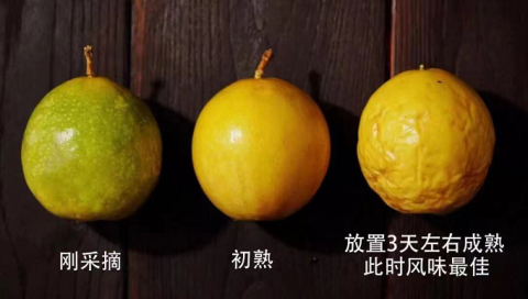 2、新鲜的黄金百香果表皮有部分泛青,此时口感会偏酸。在阴凉干燥处静置 3~5 天,表皮逐渐出现褶皱,甜度会更高,此时最适合吃
