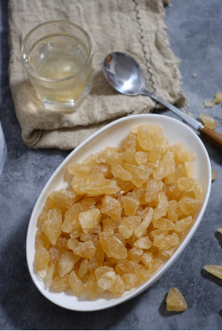 熬出来的老冰糖晶莹透亮,就像未打磨的黄宝石,之地纯净,柱冰无砂心,底冰无砂底,入口清甜,还带淡淡的甘蔗香味,不像普通冰糖那样齁甜,可以直接给小朋友当零食,解馋又去火