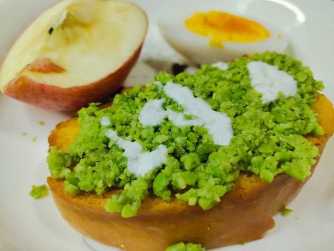 这是我女儿最喜欢的一款早餐,豌豆酱抹面包,大概是豌豆的高颜值,也可能因为豌豆自带的清甜,每逢遇到这份早餐女儿总会问:“豌豆泥明天还能有吗?”