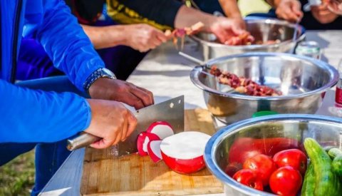 中午12点左右抵达天下第一曲水莫日格勒河河边烧烤,领队早已为大家准备好烧烤的炉具和煮手把肉的炉子与锅,下面就是队员们自己动手的时刻了,切肉,穿串要做好分工哦!领队负责生火和煮手把肉。