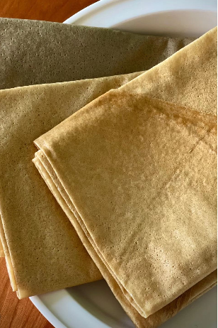五粮煎饼来自延边敦化,长白山下,朝鲜族居民为主!煎饼是由五谷,大米、大豆、玉米糁、小米、高粱,混合摊烙成薄饼,一点点微甜,但并未加糖,甜味来自于独特的发酵工艺,杂粮磨浆后发酵一段时间,使得淀粉转化成了糖粉.