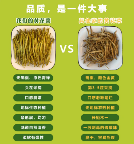 1、收到的黄花是绿色的而不是黄色,因我们要最大程度的保留黄花的原色原味,没有进行硫熏,所以不会变黄。