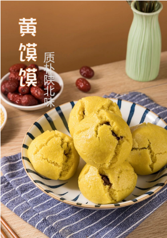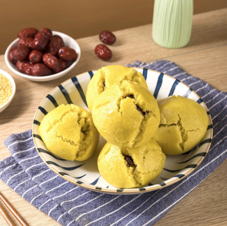 在陕北高原的沟壑纵横间,一种金黄色的传统面食已经飘香了上千年。黄馍馍,被称为黄土高原上的"金色明珠"。外皮香韧,口感略粗糙,较白面皮在松软之余又多了一股筋道。豆馅绵软甜糯,夹杂着红豆的颗粒和枣泥的丝丝口感,香甜的枣泥混着豆沙保留着最地道的陕北风味,每一口都那么质朴