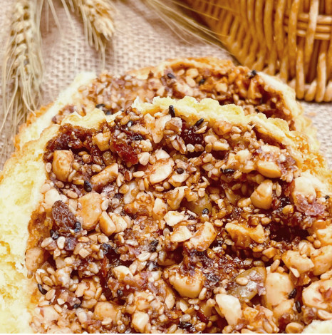 配料:石磨老麦面粉,小米面,黑芝麻,白芝麻,核桃仁,杏仁,花生,腰果,南瓜籽,葡萄干,红糖,白糖,制作而成