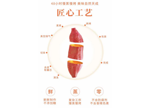 以小香薯为原料,带着皮儿,整根制作,三蒸三晒,低温慢烤