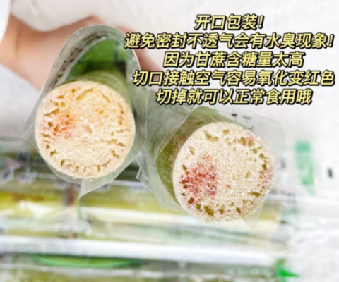 每根甘蔗都是独立包装,因甘蔗含糖量比较高,切口处接触空气会形成氧化从而显红色,收到货后把红色切掉即可正常食用(切下去1-2厘米)。
