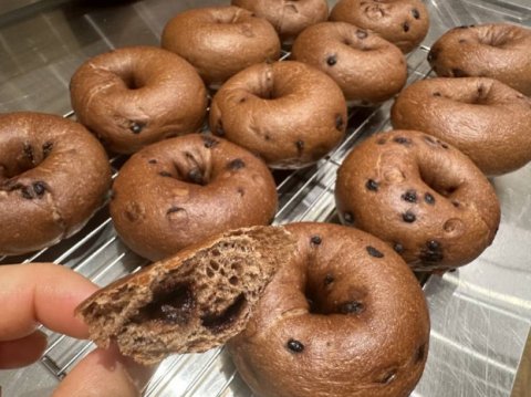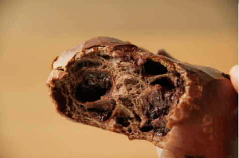 很有心的用三种不同形态巧克力造就丰富口感。可可粉助力面包体,可可豆增加颗粒感,巧克力币则是充沛夹心