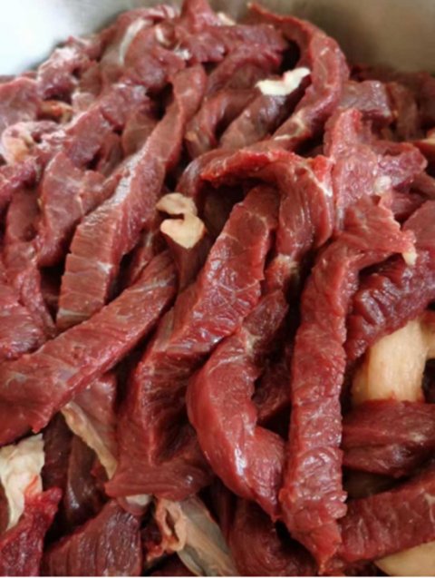 呼伦贝尔大草原的草地溜达牛,以300余种天然牧草为食,在零下40℃的极寒中练就紧实肌肉,脂肪均匀如雪花沉积,是制作牛肉干的上等食材。牛肉干只选取牛后腿部位,肉质纤维如琴弦般细密,肌理间渗透着草原的芬芳。这是牛肉干灵魂的起点,是天地与生灵的默契合谋