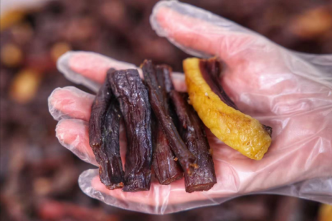 白昼吸收300种牧草的光合能量,夜晚凝结零下20℃的霜华,历经几个昼夜交替,水分蒸发殆尽,肉质收缩成琥珀色的“纤维琥珀”,风干牛肉干就制作成功了。还需要经过蒸/烤/炸等不同方式做成可以直接食用的牛肉干