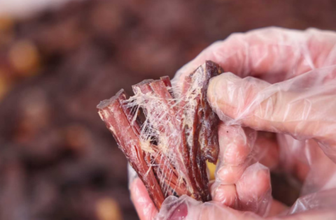 剔除筋膜,手工切条,自然风干等一系列繁琐的程序都需要纯手工完成,保留了肉质的原始纤维和营养成分