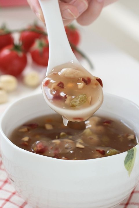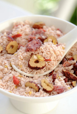 配料:藕粉、冰糖、葡萄干、蔓越莓干、腰果仁、南瓜籽仁、木瓜丁、红枣丁、哈密瓜丁、桂花干