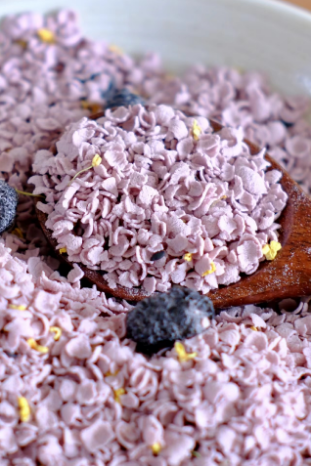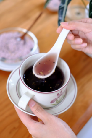 添加了桂花、黑豆、黑芝麻、黑米、黑枸杞、黑藜麦、黑桑葚,以上食材混合在一起,让藕粉的口感和营养变得更丰富了