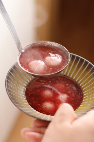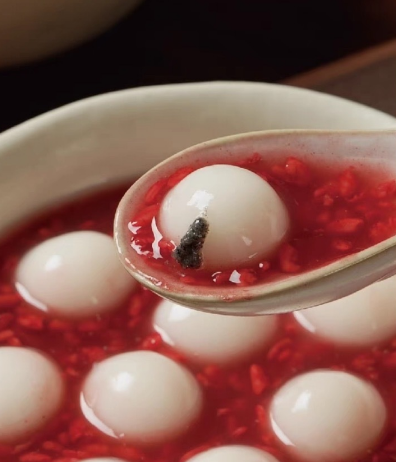 宁波当地非常有名的一道美食---红曲酒酿圆子核桃羹