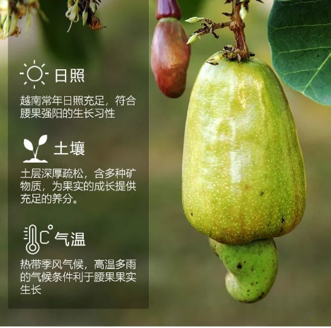 腰果对于生长环境非常苛刻:雨水丰沛、日照充足的热带气候是基础,还得等上3年才结果,7-8月才进入丰产期,妥妥的慢生长“贵族”