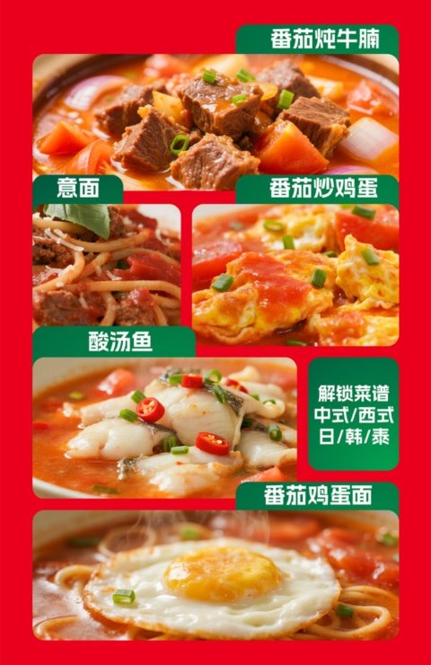 可实现:番茄炖牛腩、意面、番茄炒鸡蛋、酸汤鱼、番茄鸡蛋面等