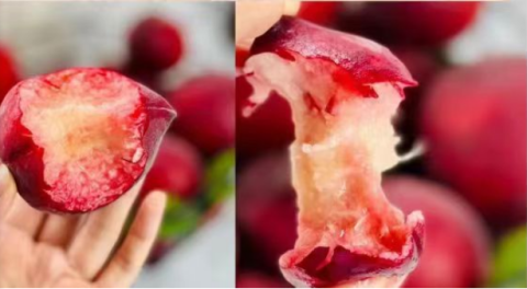 这是一颗从外红到里的桃子,名叫“沙漠胭脂桃”